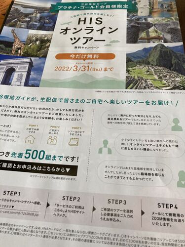 三井住友カードを所有しているのですが、冊子とともに、こんなチラシが入っていまして・・・・ 以前から、オンラインツアーに興味がありました。 でもなかなか、思いきれなくて・・・・・ 今回、無料で参加できる!ということで参加してみました~~。 「ご…
