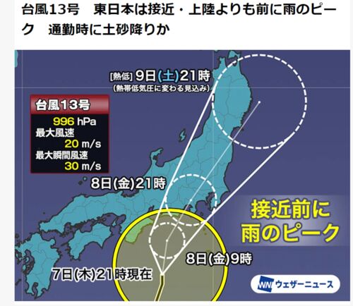 本当は、本日、朝早く出発して、青春18切符で東京へ向かうはずだったのですが・・・ 当初、金曜日には、もう過ぎ去っているし、もしかしたら、東寄りになっているかも知れない。と思っていたのが、 なかなか進んで行かず、進路も、東に寄らず、こんな感じ。 …