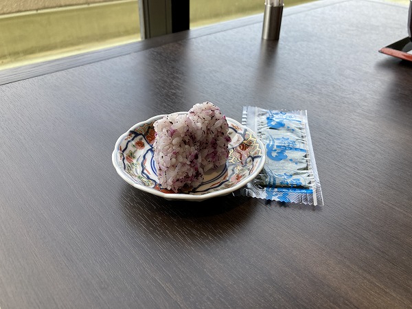 後から、追加した、「ゆかり」のミニおにぎり2つ。2つセットで、小皿に乗って提供されています。隣に、味付け海苔が置いてあったので、それも持ってきました。
