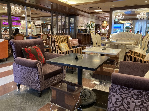 手前のテーブルは、フロント内にあるテーブル。向こう側が、レストランと、その向こうは、ショップ。