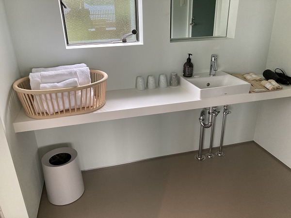 洗面所。ホテルに泊まった時に、お風呂に行く用の、可愛いポーチ(お持ち帰り可)があったのに、ここには、なかった。