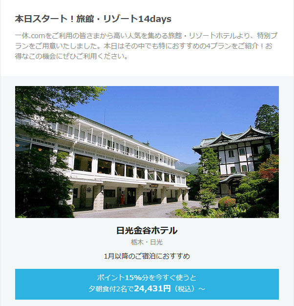 「本日スタート!旅館・リゾート14days/日光金谷ホテルなど」