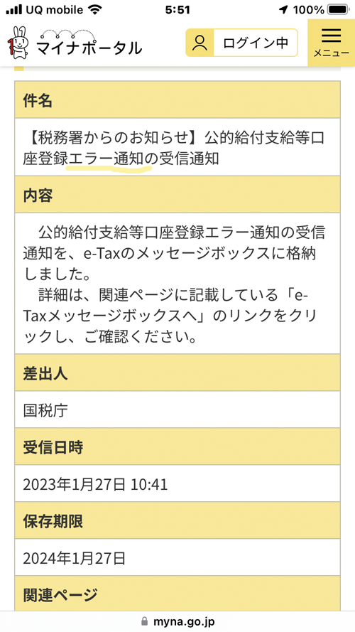 「新しいお知らせが届いています。 マイナポータルにログインして確認してください」