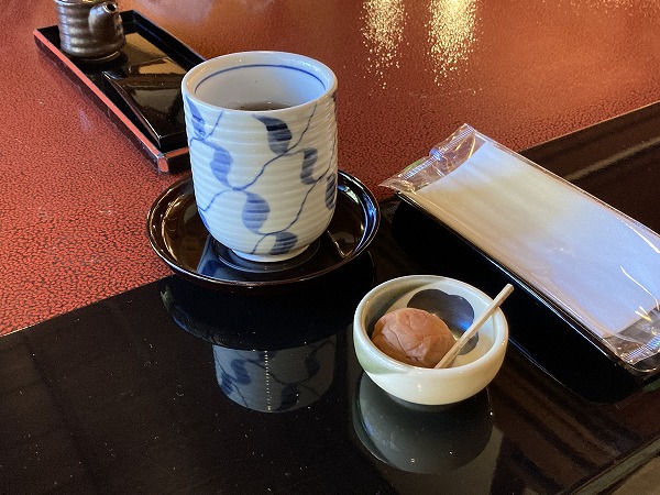 最初に、梅干しとお茶が出てきました。