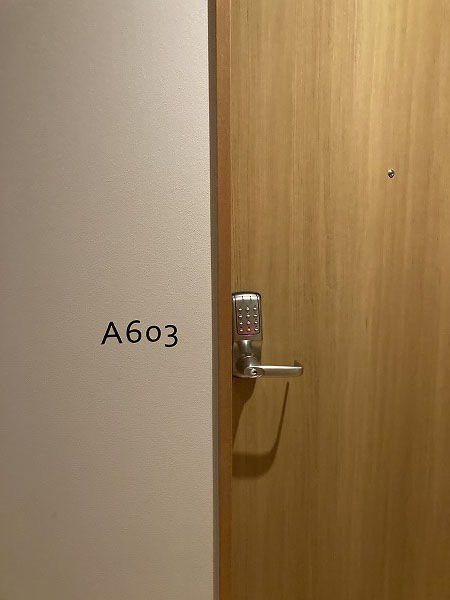 お部屋は、A603。カードキーじゃなくて、暗証番号で入ります。暗証番号を忘れるといけないけれど、キーを持ち歩かなくてもいいし、フロントに預けなくてもいいし、複数人でも、OKだし、これはなかなか良いですねー。
