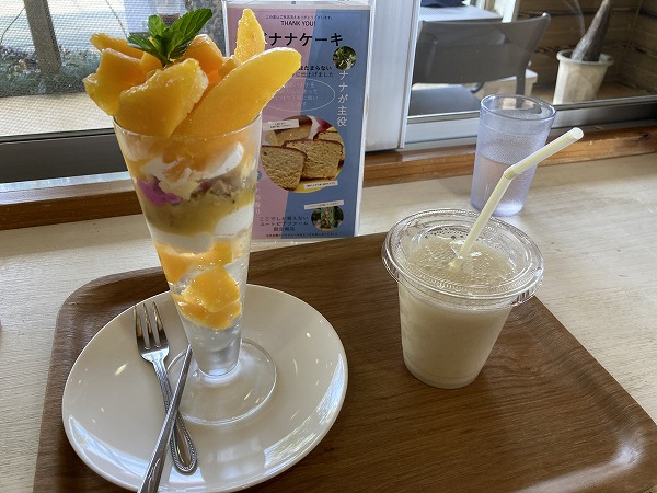来ましたー。マンゴーパフェ。と、なんだっけ?バナナジュースか。
