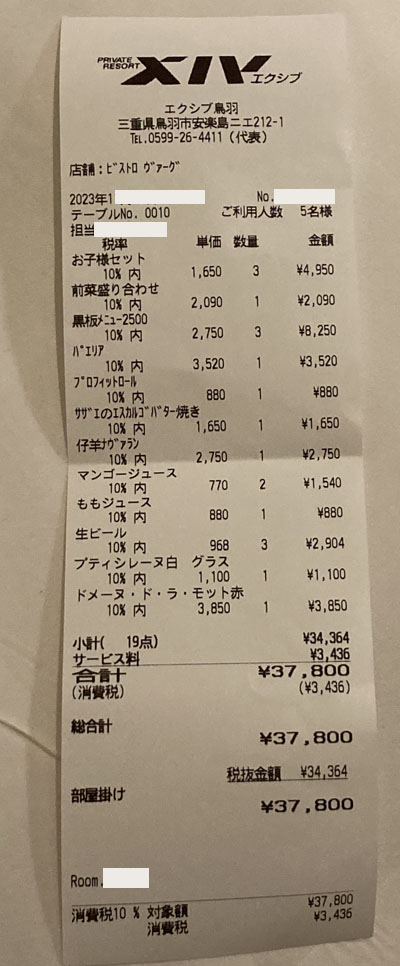 もし、大人コースを頼んだとしたら、それだけで、35,200円。それにお子ちゃまセットとドリンク追加して、合計55,466円くらい?(税込み・サービス料込)
