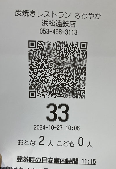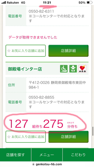 遠鉄店。11時21分で、206分待ち。3時間じゃないね。3時間半だね。