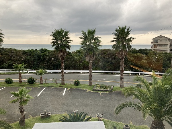 窓からの眺め。オーシャンビューですが、あの木、森みたいな所が遮っています。この写真の右端に見えるのは、お高い「月の渚」お宿。あちらは、まさにオーシャンビューですかねー。