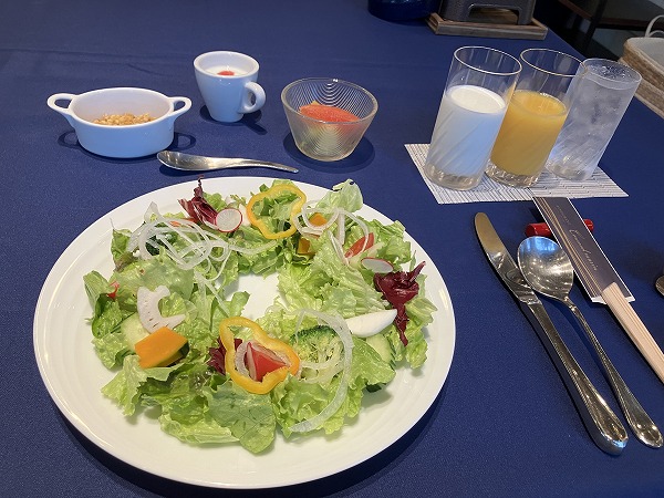 サラダ。いつも、こんなの。綺麗に盛り付けしてあって、多い。