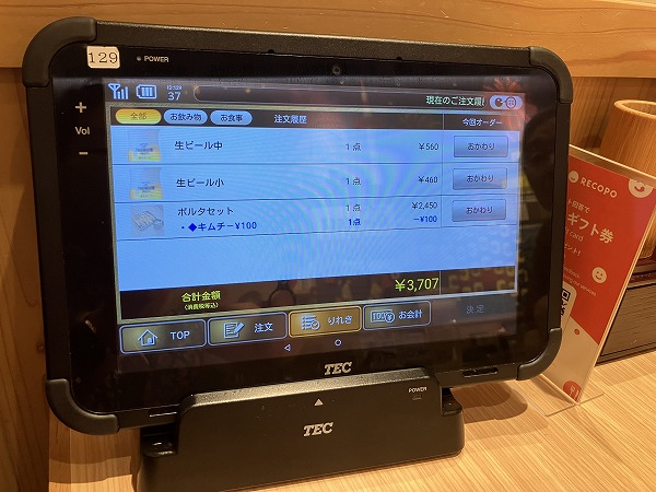 タッチパネルを後から、見たら、「お冷」もあったよ。